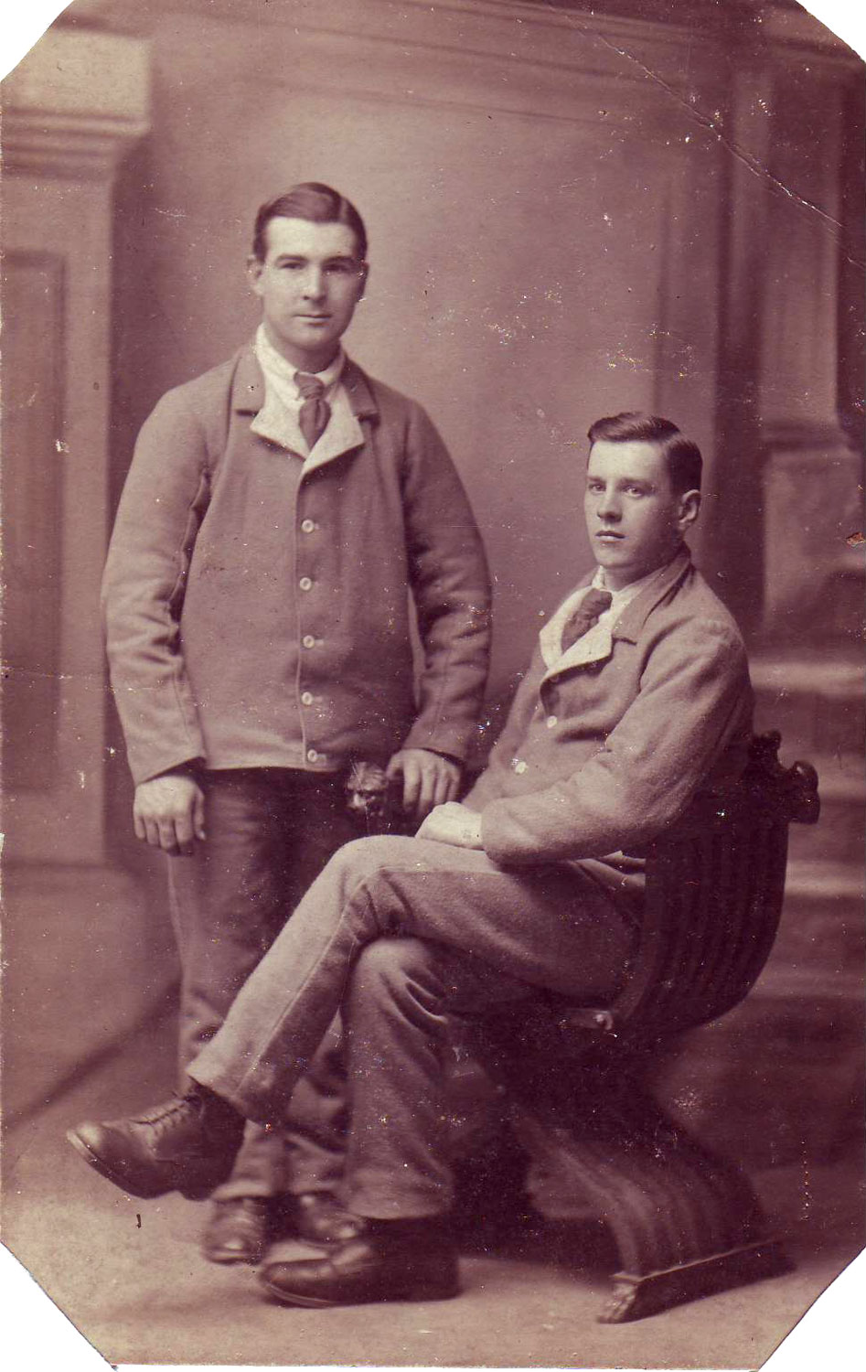 Private Thomas Hunter Swainston, 63143(right). Before the war, Thomas Hunter Swainston was a colliery pony driver, living with his parents at 5 Fulton Terrace, Shildon. He initially served with the Yorkshire Regiment (18305), and transferred to the West Yorkshire Regiment after recovering from wounds. (Wounded Q4 1915). The above photo was taken in hospital. |