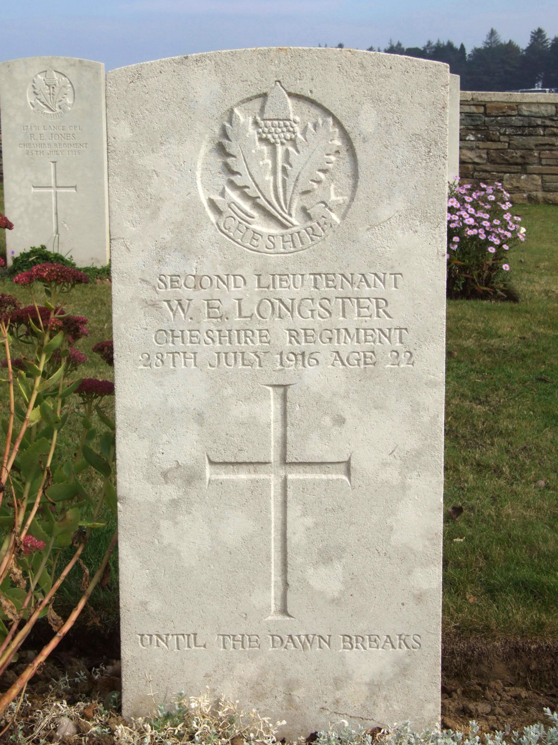 10th Battalion the Cheshire Regiment, formerly 2871 5th Battalion the Yorkshire Regiment. Son of Mr. I. W. and Mrs. A. E. Longster, of 20, Belle Vue Terrace, Malton, Yorks. Killed 22 July 196. Aged 22. Born Malton, Enlisted Malton, Resided Malton. (Wiliiam Ernest Longster was originally a Serjeant in the 5th Battalion Yorkshire Regiment, before being commissioned into the Leicester Regiment and transferred into the Cheshire Regiment. Before the war, he was a journalist on the staff of the "Malton Messenger". Ref. Malton and the First World War.) "UNTIL THE DAWN BREAKS"