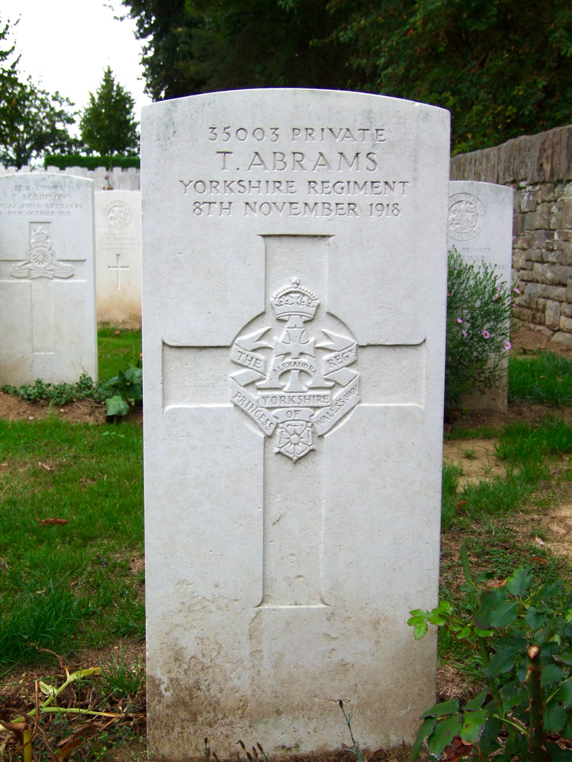 4th Battalion the Yorkshire Regiment, formerly 44024 Royal Welsh Fusiliers. Died 8 November 1918. Born Runcorn (Cheshire), Enlisted Flint. (There is more information on Thomas Abrams, including information on how he died, his family and photos of his headstone and a family headstone, on the Flintshire War Memorials Project website.) |