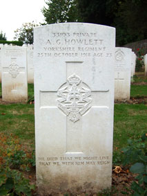 5th Battalion the Yorkshire Regiment, formerly 3106 Norfolk Regt. Son of Mr. and Mrs. H. Howlett, of 21, Waddington St., Norwich. Died 25 October 1918. Aged 23. Born Norwich (Norfolk), Enlisted Norwich. "HE DIED THAT WE MIGHT LIVE THAT WE WITH HIM MAY REIGN" |