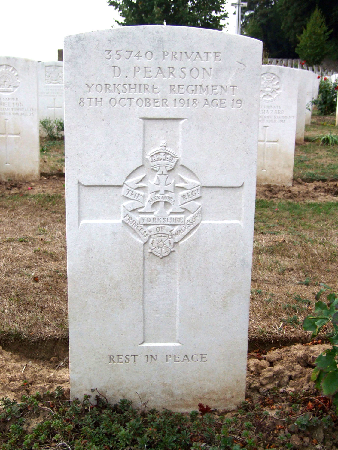 5th Battalion the Yorkshire Regiment, formerly 4648 12th Yeo. Cyclist Battn. Son of Laura Pearson, of 19, Court Rd., Sparkhill, Birmingham. Died 8 October 1918. Aged 19. Born Birmingham, Enlisted Birmingham, Resided Sparkhill. (CWGC has Battalion as "1st"; SDGW has Battalion as "5th" - the more likely). "REST IN PEACE"