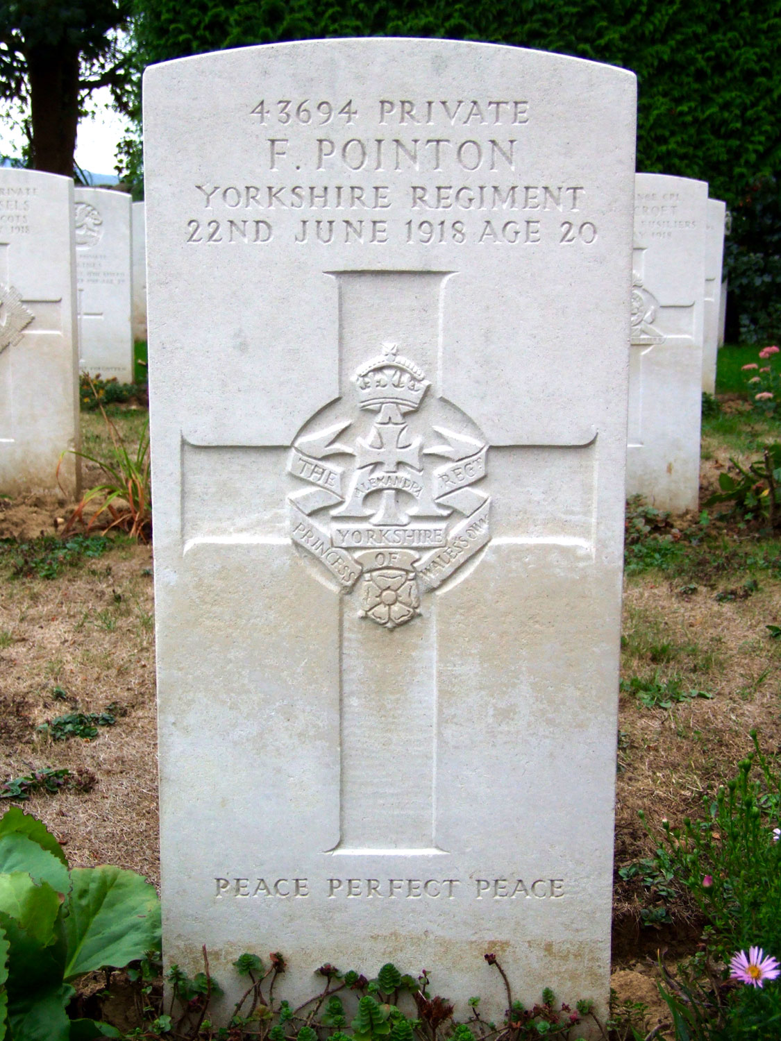 | Private Frank Pointon. 43694. 13th Battalion the Yorkshire Regiment, formerly 70786 87th T R Battn. Son of Mrs. Susan Pointon, of 40, Livingstone St., Leek, Staffs. Died 22 June 1918. Aged 20. Born Leek (Staffs), Enlisted Leek. "PEACE PERFECT PEACE" |