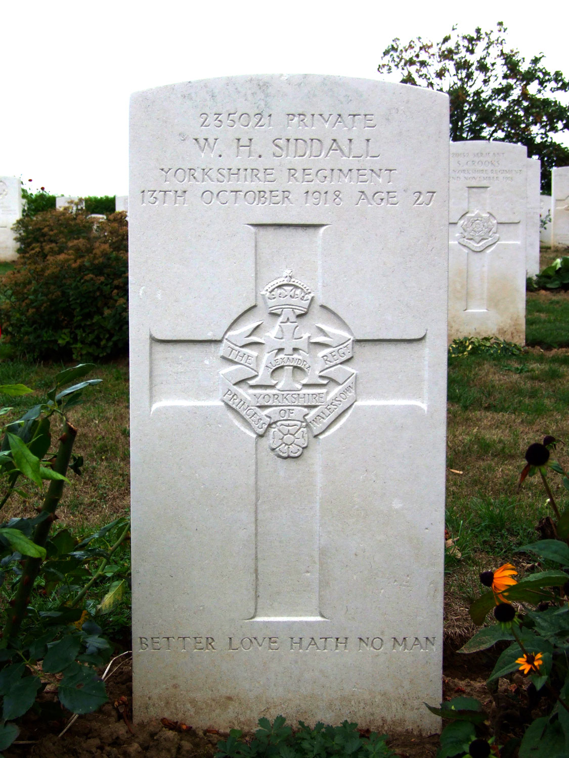 4th Battalion the Yorkshire Regiment. Son of J. T. and Lenora Siddall, of 14, Windsor Crescent, Bridlington, Yorks. Died 13 October 1918. Aged 27. Born Bridlington, Enlisted Bridlington. "GREATER LOVE HATH NO MAN" |