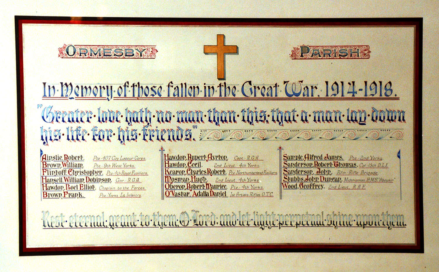 The First World War Roll of Honour inside St. Cuthbert's Church, Ormesby, commemorates 17 men who lost their lives in the war. These names were also originally on the War Memorial in St. Cuthbert's churchyard, though the names on the War memorial have become weathered and illegible.