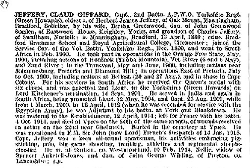 JEFFERY Born at Manningham, Bradford, 13th April, 1880, son of Herbert J. Jeffery, of Bradford. Husband of Nellie Jeffery, of Coldingham, Winchfield, Hants. 2nd Lieut., 14th September, 1901; Lieut., 12th May 1904; Capt., 25th August, 1909 ; Adjt., 1st March, 1910—12th April 1912; Egytian Army, 12th April, 1912—12th April, 1914. Served with the Volunteer Company in the Boer War, 1900-02, and took part in the march from Bloemfontein to Pretoria, including the actions at Brandfort, Vet and Zand Rivers, Kroonstadt and Johannesburg. Also in the advance eastwards and actions at Diamond Hill and Belfast (Queen's medal and 5 clasps. King's medal and 2 clasps). Proceeded to Belgium with 2nd Battn. in October, 1914. Whilst leading a party of volunteers to repel an attack by a large force of the enemy near Becelaire, he was wounded in the groin, on the 22nd October (mentioned in despatches). Died in hospital, near Ypres, 24th October, 1914. An officer who was with him in hospital said that Captain Jeffery was one of the most gallant men he ever met, popular with all officers and beloved by his men. When men from the regiment were brought in wounded to the hospital their first question was " How is Captain Jeffery ? " Buried in Ypres Town Cemetery A biography of Captain Jeffery can be found in De Ruvigny's Roll of Honour. By selecting the link on the left, a copy of this entry can be obtained. The image quality is not too good, but is sufficiently adequate to learn more of Captain Jeffery's background and family life. |