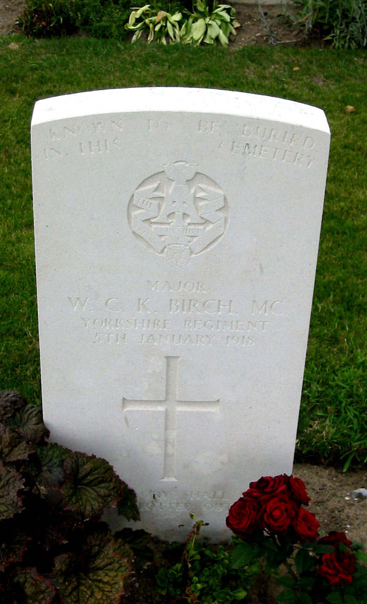 | Major William Claud Kennedy Birch, MC. 2nd Battalion the Yorkshire Regiment. Killed 5 January 1918. KNOWN TO BE BURIED IN THIS CEMETERY "STILL TO MEMORY DEAR" Photo by Terry Holmes (<terryholmes@hotmail.co.uk>) |