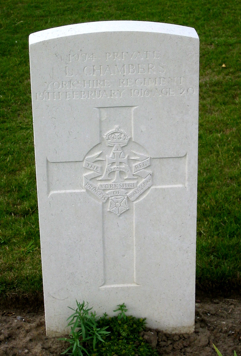 | Private Louis Chambers. 1974. 5th Battalion the Yorkshire Regiment. Son of William and Christiana Chambers, of Seamer, Scarborough. Killed 15 February 1916. Aged 20. Born Seamer (Scarborough), Enlisted Scarborough, Resided Seamer. Photo by Terry Holmes (<terryholmes@hotmail.co.uk>) |
