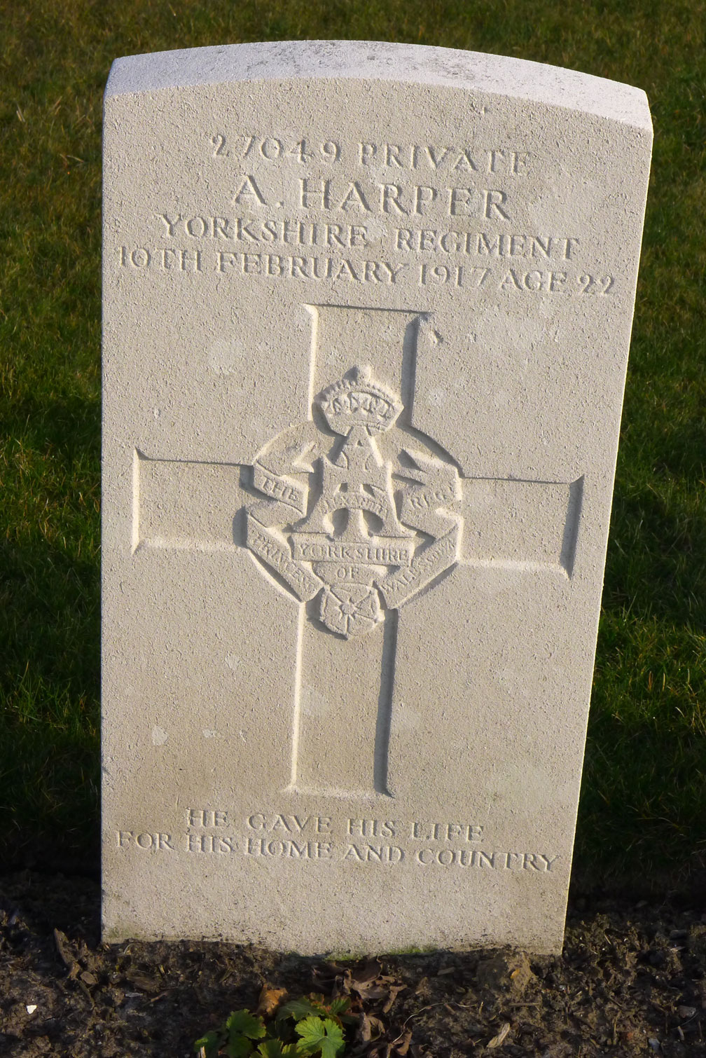 | Private Alfred Harper, 27049. 8th Battalion Yorkshire Regiment. Son of William Edward and Mary Harper, of Carleton House, Barnoldswick, Yorks. Killed 10 February 1917. Aged 22. Born Carleton (Yorks), Enlisted Skipton, Resided Barnoldswick (Yorks). Photo : Christopher Weekes <weebex12@hotmail.com> |
