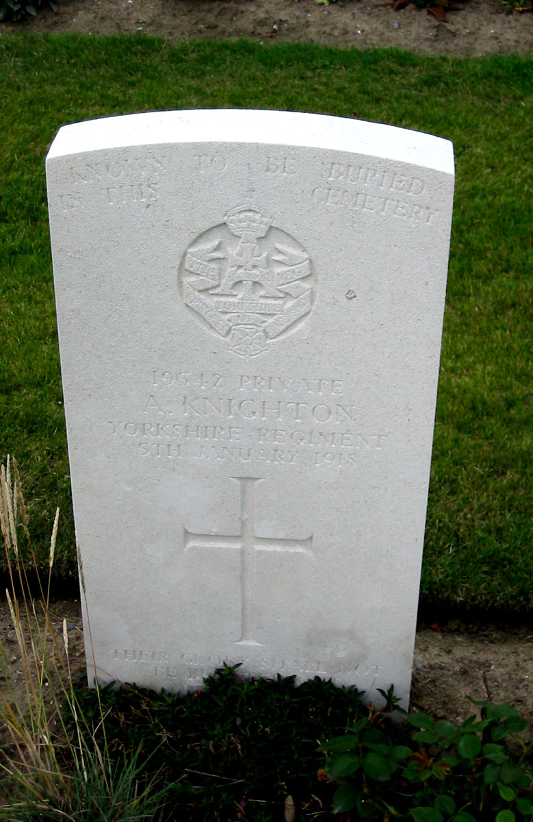| Private Arthur Knighton. 19542. 2nd Battalion the Yorkshire Regiment. Killed 5 January 1918. Born Bankhead (Durham), Enlisted Houghton-le-Spring, Resided Fencehouses. KNOWN TO BE BURIED IN THIS CEMETERY "THEIR GLORY SHALL NOT BE BLOTTED OUT" Photo by Terry Holmes (<terryholmes@hotmail.co.uk>) |