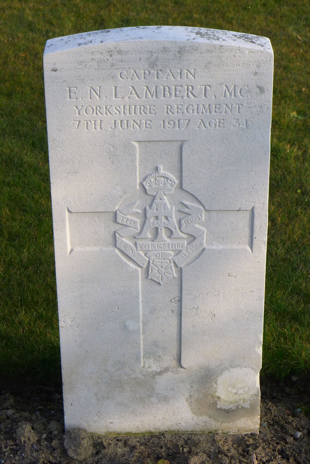 | Captain Eric Noel Lambert, MC. 8th Battalion the Yorkshire Regiment. Son of Mr. Robert Carr Lambert and Mrs. Lambert, of I, Norton Rd., Hove, Brighton. Born at Liverpool. Killed 7 June 1917. Aged 34. Photo : Christopher Weekes <weebex12@hotmail.com> |