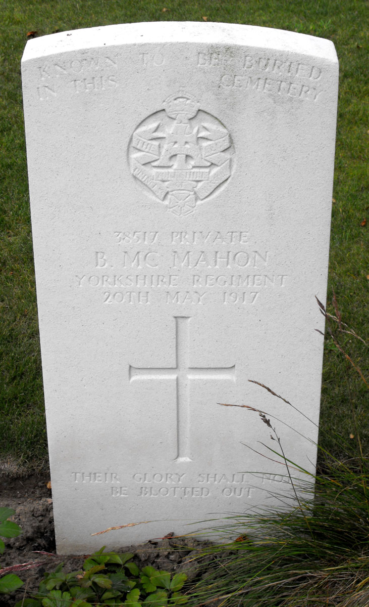 | Private Bernard McMahon. 38517. 9th Battalion the Yorkshire Regiment. Killed 20 May 1917. Born Carrickmacross (Monahan), Enlisted Middlesbrough. KNOWN TO BE BURIED IN THIS CEMETERY "THEIR GLORY SHALL NOT BE BLOTTED OUT" Photo by Terry Holmes (<terryholmes@hotmail.co.uk>) |