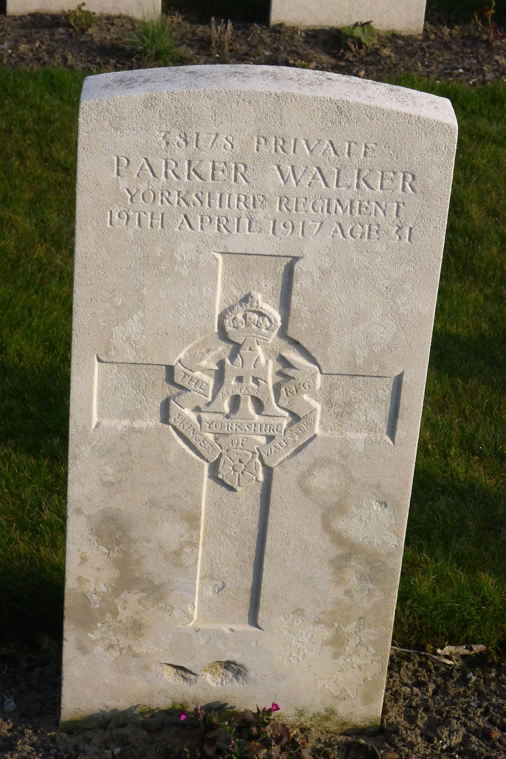 | Private Parker Walker, 38178. 9th Battalion Yorkshire Regiment. Son of John and Eliza Walker, of 3, East Terrace, Skelton-in-Cleveland, Yorks. Killed 19 April 1917. Aged 31. Born Skelton (Yorks), Enlisted Brotton, Resided Skelton (Yorks). Photo : Christopher Weekes <weebex12@hotmail.com> |