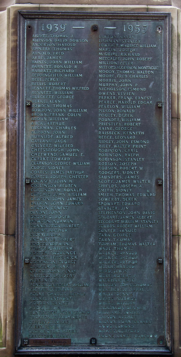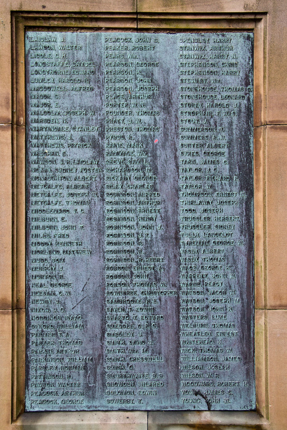 The names of the dead from the First World War are on two bronze panels on either side of the pedestal. The names of the dead from the Second World War are on a single bronze panel at the rear of the pedestal.