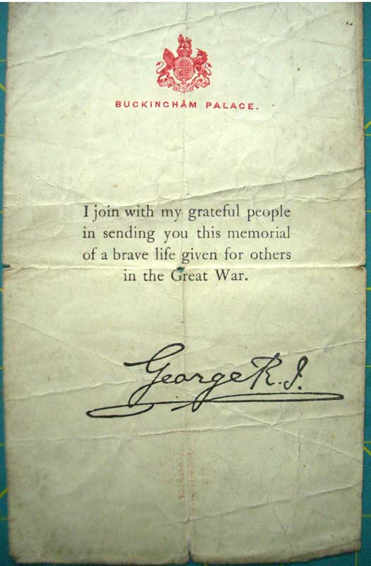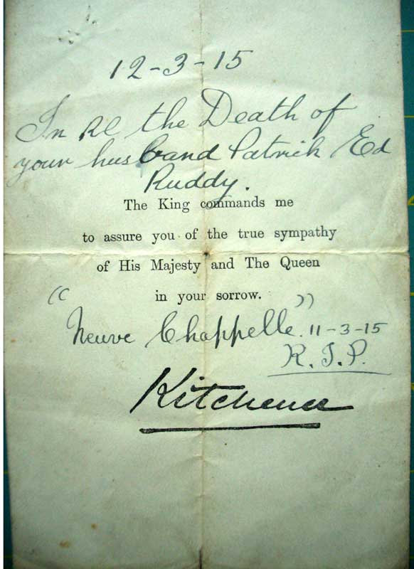Colonel Stevenson sent the website a photograph of the letter signed by Lord Kitchener in which Patrick Edward Ruddy's wife had been informed of his death (see below). He also sent a photograph of a commemorative letter signed by the King, and a photograph of the Birth Certificate of Patrick Edward Ruddy's daughter, who was born just four years before her father was killed. The daughter, Mary, was Colonel Stevenson's grandmother. Patrick Edward Ruddy's family originally came from Ireland, but he had been born and had enlisted in Leeds.