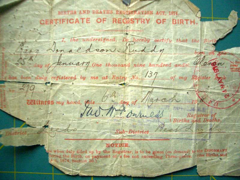 | The letter, signed by Lord Kitchener, informing Patrick Edward Ruddy's wife of his death in the Battle of Neuve Chapelle. | The letter of commemoration, received by Patrick Edward Ruddy's wife, signed by King George V. | The Birth Certificate for Patrick Edward Ruddy's daughter, Mary, who was born on 25 January 1911. | ||
