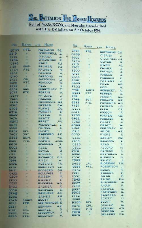 There is a commemorative book in the Green Howards Museum which provides not only an account of the First Battle of Ypres as fought by the 2nd Battalion Yorkshire Regiment in 1914, but also a Roll of the Officers and Men who embarked for Belgium with the Battalion in October 1914. The book is hand-written (apart from the account of the battle, in typescript), with illustrated lettering. In this book, a Private Ruddy, 7150, is listed. See below.