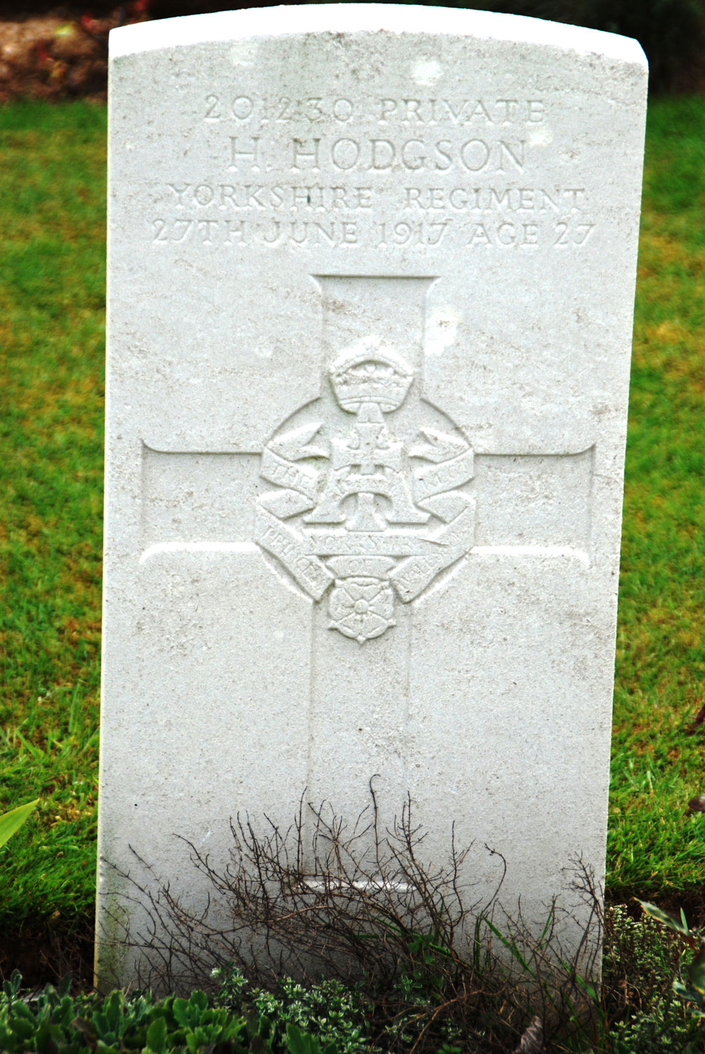 Private Herbert Hodgson, 201230. 4th Battalion Yorkshire Regiment. Son of William and Sarah Ann Hodgson, of 16, Railway Terrace, Sowerby, Thirsk, Yorks. Killed 27 June 1917. Aged 27. Enlisted Northallerton, Resided Sowerby (Thirsk). |