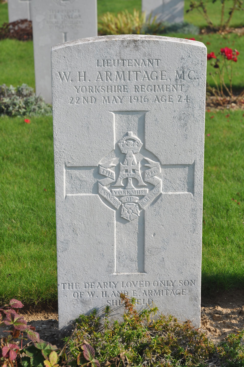 MC. 9th Battalion Yorkshire Regiment. Only son of William Henry and Eleanor Armitage, of 34, Rutland Park, Clarkehouse Rd., Sheffield. Died 22 May 1916. Aged 24. "THE DEARLY LOVED ONLY SON OF W H AND E ARMITAGE OF SHEFFIELD" |
