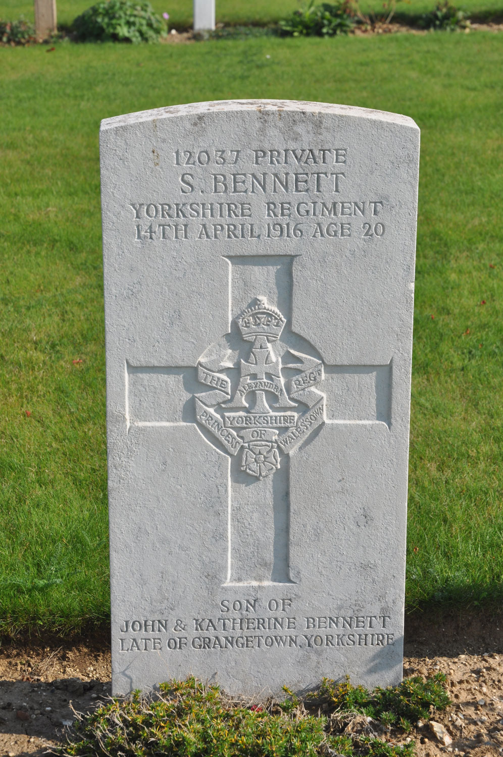 | Private Stephen Bennett. 12037. 8th Battalion Yorkshire Regiment. Son of John and Katherine Bennett, of Grangetown, Yorks. Died 14 April 1916. Aged 20. Born Grangetown (Yorks), Enlisted South Bank, Resided Grangetown. "SON OF JOHN & KATHERINE BENNETT LATE OF GRANGETOWN, YORKSHIRE" |