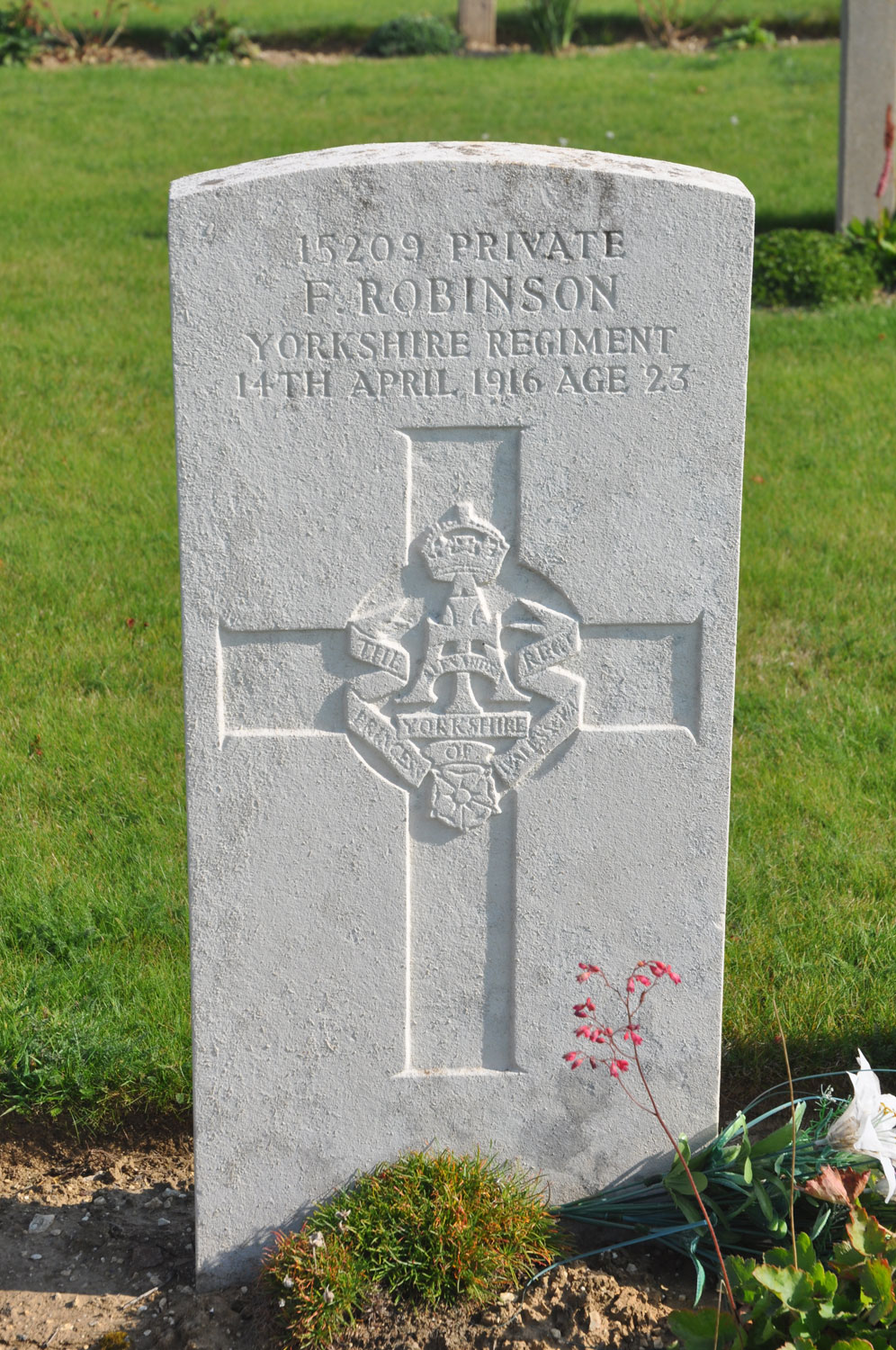8th Battalion Yorkshire Regiment. Son of Mrs. Sarah Robinson, of 7, Richmond St., Hallfield Rd., Layerthorpe, York. Killed 14 April 1916. Aged 23. Born York, Enlisted York. |