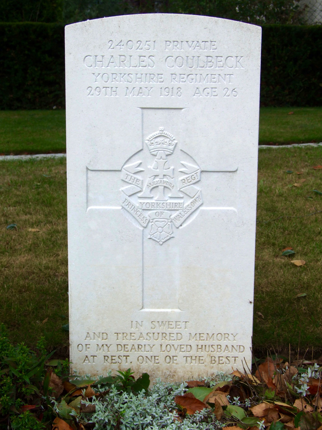 5th Battalion the Yorkshire Regiment. Son of William Coulbeck; husband of Gertie E. Coulbeck, of 3, Peel Place, North Bar St., Beverley, Yorks. Killed 29 May 1918. Aged 26. Born Beverley, Enlisted Beverley. "IN SWEET AND TREASURED MEMORY OF MY DEARLY BELOVED HUSBAND AT REST. ONE OF THE BEST" |