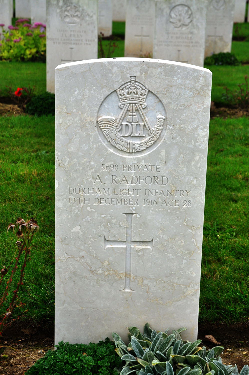 | Private Albert Radford. 5698. 6th Battalion Durham Light Infantry, formerly 30596 the Yorkshire Regiment. Son of Richard and Mary Ann Radford, of 1, East View, Long St., Thirsk. Killed 14 December 1916. Aged 28. Enlisted Richmond (Yorks), Resided Thirsk. |