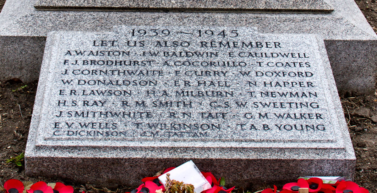 The commemoration on the memorial is shown in further detail in a photograph below. Three faces are dedicated to those who fell in the First World War. There is also a commemorative plaque for the men of Marsden District who gave their lives in both World Wars. Another plaque commemorates those from Whitburn who lost their lives in the Second World War. Photographs of all these commemorations are shown below.