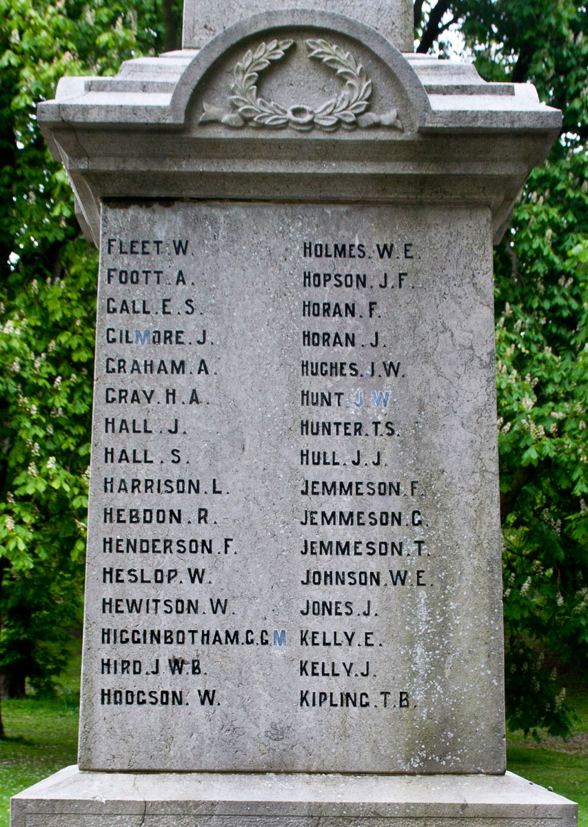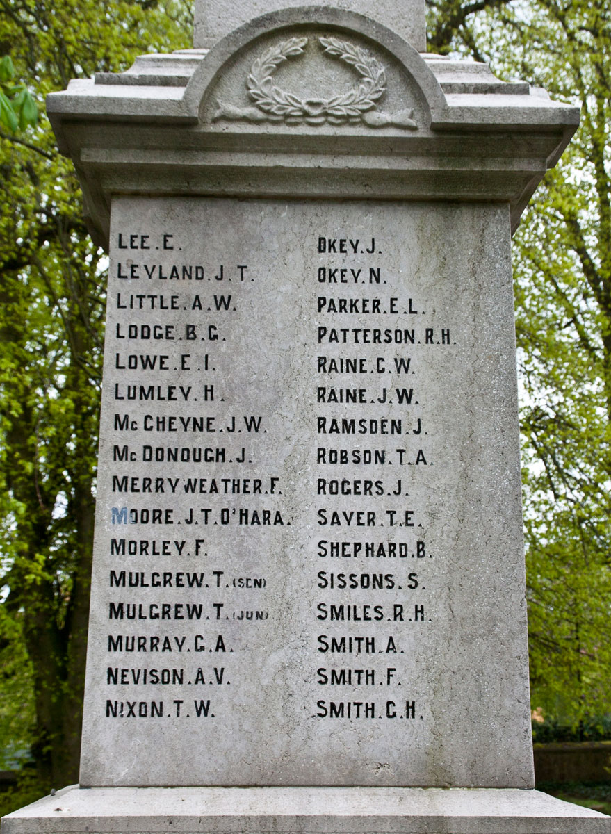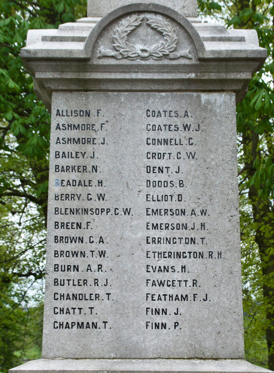 125 names commemorate those who died in the First World War. Of these names, 9 are for soldiers of the Yorkshire Regiment. Images of the faces on which the names are recorded, suitable for transcription, are shown below.