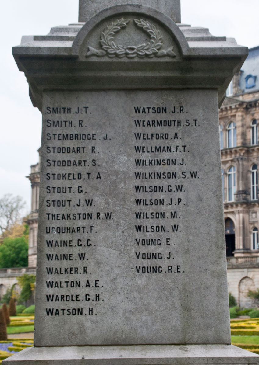 The War Memorial for Barnard Castle is situated in the grounds of the Bowes Museum, in the South East corner of the gardens. The memorial is a column with the names of those who died in the First World War inscribed on each of its four faces. A plaque commemorating those who died in the Second World War is situated on the front of the memorial, on the steps.