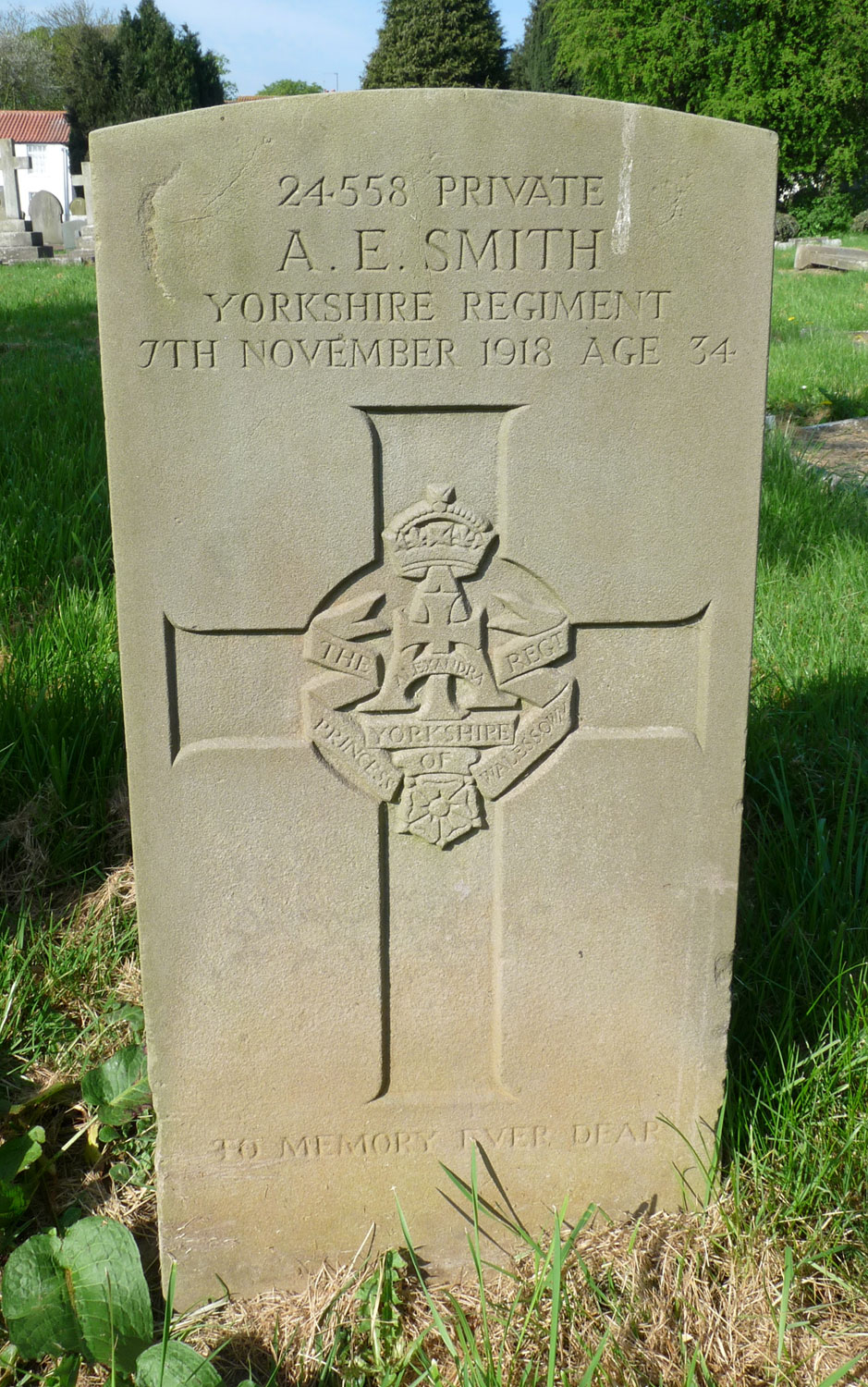 3rd Battalion the Yorkshire Regiment. Son of John & Annie Smith. Husband of Maud Smith, of 38, St. Andrew St., Beverley. Died at home 7 November 1918. Aged 34. Born Beverley. "TO MEMORY EVER DEAR" |