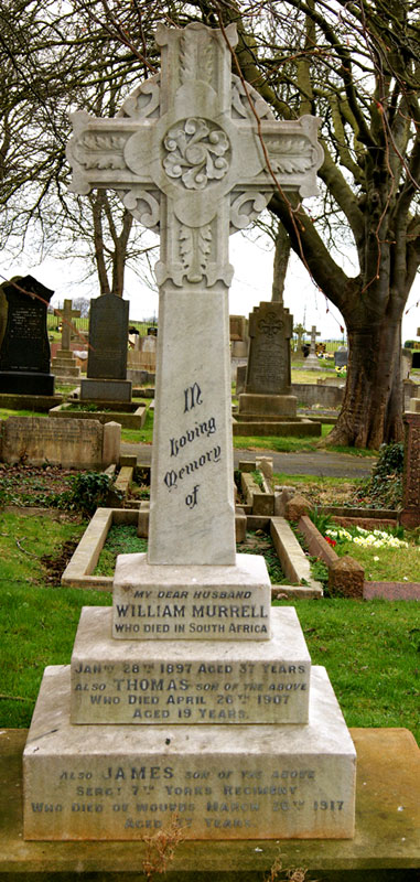 Murrell, 13817. 7th Batallion the Yorkshire Rgiment. Died at home 6 April 1917. Aged 27. Very curiously, the Commonwealth War Graves record shows the date of death as 6 April 1917, but the headstone records the date of death as 26 March 1917. Serjeant James Walker Murrell's Service Record survives. From this we can see that; 1 He was attested on 31 August 1914. 2 He was recorded as being severely wounded and admitted to King George's Hospital, Stanford Bridge, on 14 March 1916. 3 He was discharged as being unfit for duty 2 months later. James Walker Murrell's Service Record does not provide his date of death. |
