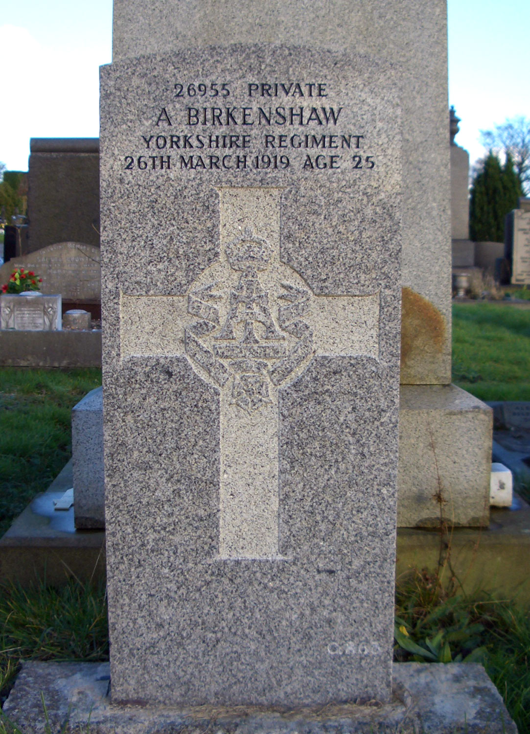One soldier who served with the Yorkshire Regiment is buried in this cemetery. We are extremely grateful to Gordon Hodgson of the World War One Cemeteries website for photographing the headstone of this soldier, and for the World War One Cemeteries website giving us permission to use the photo.