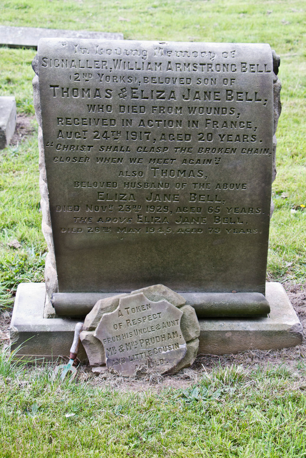 10th Battalion the Yorkshire Regiment. Died at home 24 August 1917. Born Cramlington, Enlisted Richmond (Yorks), Resided Ashington. In Loving Memory of SIGNALLER WILLIAM ARMSTRONG BELL (2ND YORKS), BELOVED SON OF THOMAS & ELIZA JANE BELL, WHO DIED OF WOUNDS RECEIVED IN ACTION IN FRANCE, AUGT. 24TH 1917, AGED 20 YEARS. "CHRIST SHALL CLASP THE BROKEN CHAIN CLOSER WHEN WE MEET THEE AGAIN." ALSO THOMAS BELOVED HUSBAND OF THE ABOVE ELIZA JANE BELL DIED NOVR. 23RD 1929 AGED 65 YEARS. THE ABOVE ELIZA JANE BELL DIED 26TH MAY 1945 AGED 79 YEARS. |