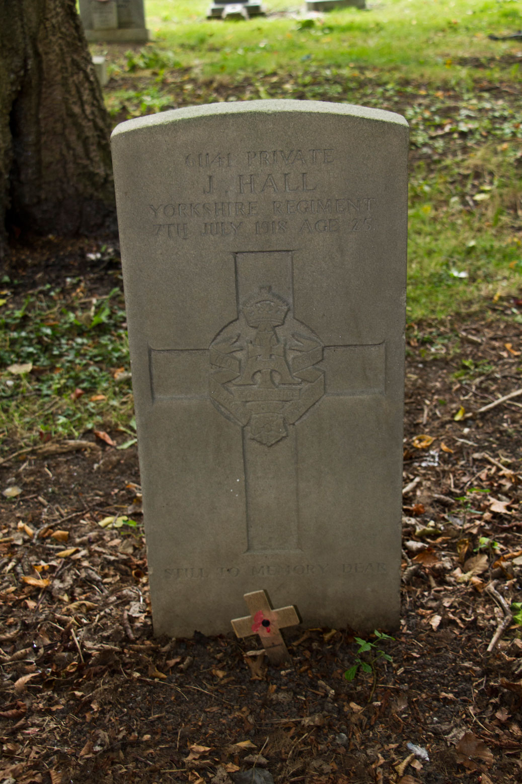 Hirst (St. John) Churchyard. Private Hall's headstone is the Second One along