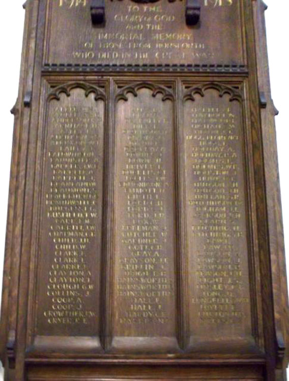 The First World war Memorial in St. Margaret's Church, Horsforth, consists of an Oak board, carved and stepped crenellated. There are 3 columns of names where the commemorations are incised in gilt lettering.
