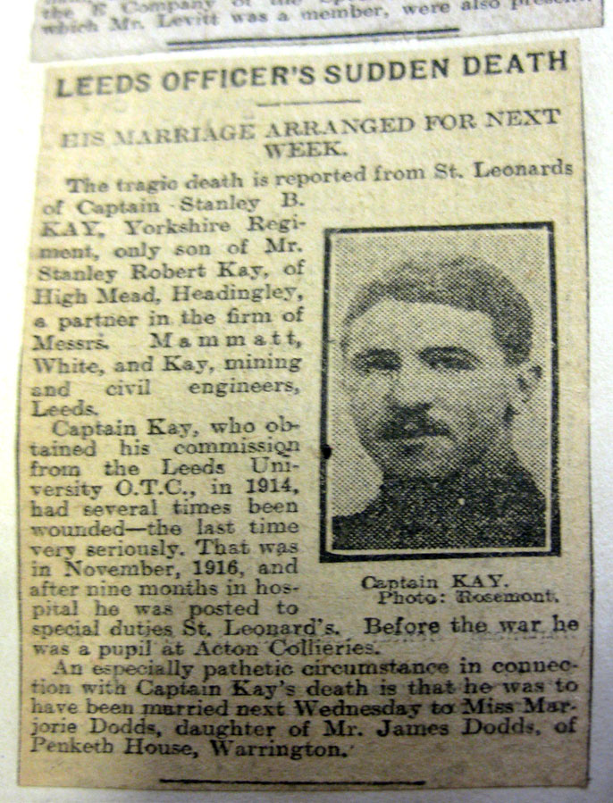 KAY. RFC, ex- 7th Battalion. Son of Stanley Robert and Hetty Kay, of High Mead, Wood Lane, Headingley, Leeds. Killed 28 January 1918. Aged 26. A Leeds man, Stanley Kay was born in the city in 1892. He served with the 7th Battalion Yorkshire Regiment, first proceeding to the front in July 1915. In February 1916 Lt Kay was wounded in action. On 5 November 1916 Lt Kay was again wounded in action in an attack close to the village of Le Transloy. On recovery he was attached to the Royal Flying Corps in 1917 and died at home on 28 January 28th 1918 aged 26. He is buried in Leeds (Lawns Wood) Cemetery. John Sly (<sly211@btinternet.com>) has written an article on the life and death of Captain Kay. This article was published in the June/July 2014 edition of "Medal News". The article is especially interesting in that the tragic death of Captain Kay has been well researched by John Sly, and makes a thought-provoking story. Select the link below to read the article. |