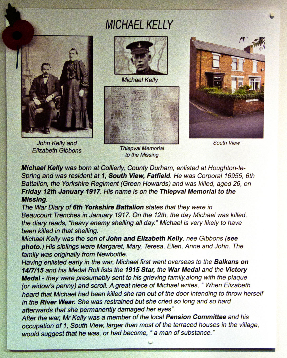 16955. 6th Battalion Son of John and Elizabeth Kelly, of 1, South View, Fatfield, Washington, Co. Durham. Killed 12 January 1917. Aged 26. Born Newbottle (Houghton), Enlisted Houghton-le-Spring, Resided Washington. Commemorated Pier and Face 3 A and 3 D, Thiepval Memorial. The above photo was supplied by Clare David (<claire_david@yahoo.com),