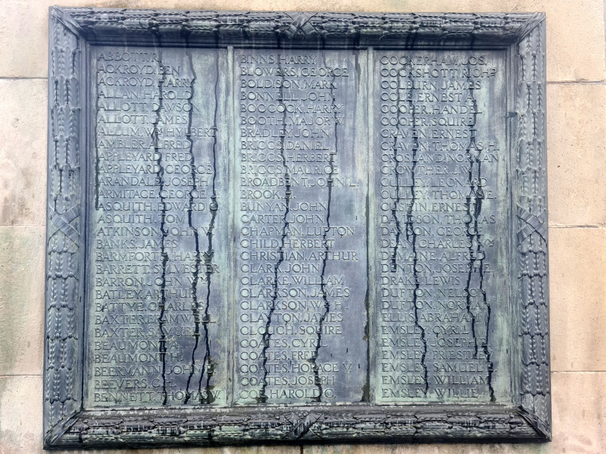 World War Commemorations "A" - "E" on the Pudsey War Memorial.