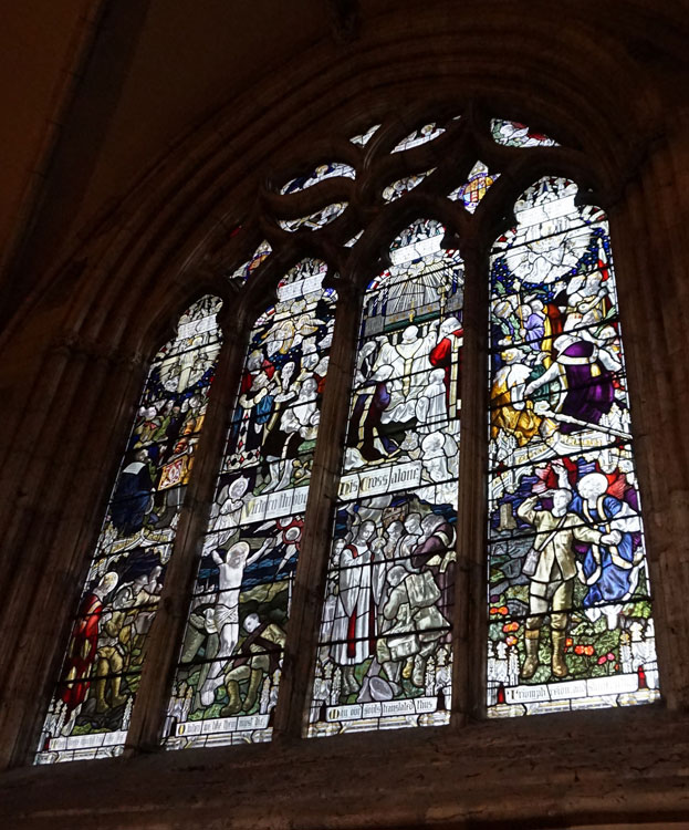 The First World War Memorial in Selby Abbey consists of wo plaques below the window with the names of those killed in the First World War. Two enamel shields of the coats of arms of Selby and See of Yorkare above the plaques. The window is a four light window and is filled by 2 rows of scenes, 8 in all plus other scenes and figures in the 10 sections of the upper tracery.
