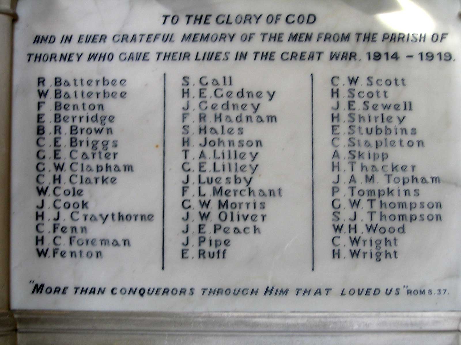 Richard Roberts (<richard.nsw@googlemail.com>) has forwarded a photo of the War Memorial for Thorney Abbey in Cambridgseshire, which includes the name of two soldiers of the Yorkshire Regiment. The War Memorial is a stone tablet in the Church of SS Mary and Botoplh.