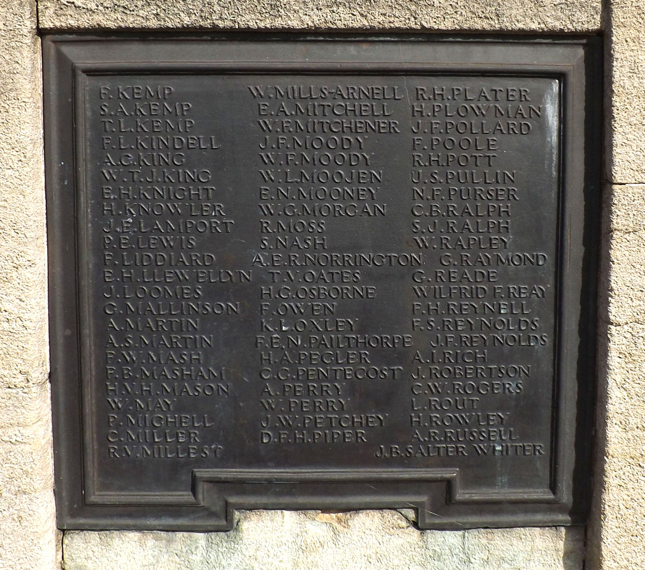 274 names are commemorated as having lost their lives in the First World War. A transcript of the names is on the Imperial War Museum's Register of War Memorials website, as well as on the Surrey in the Great War website.